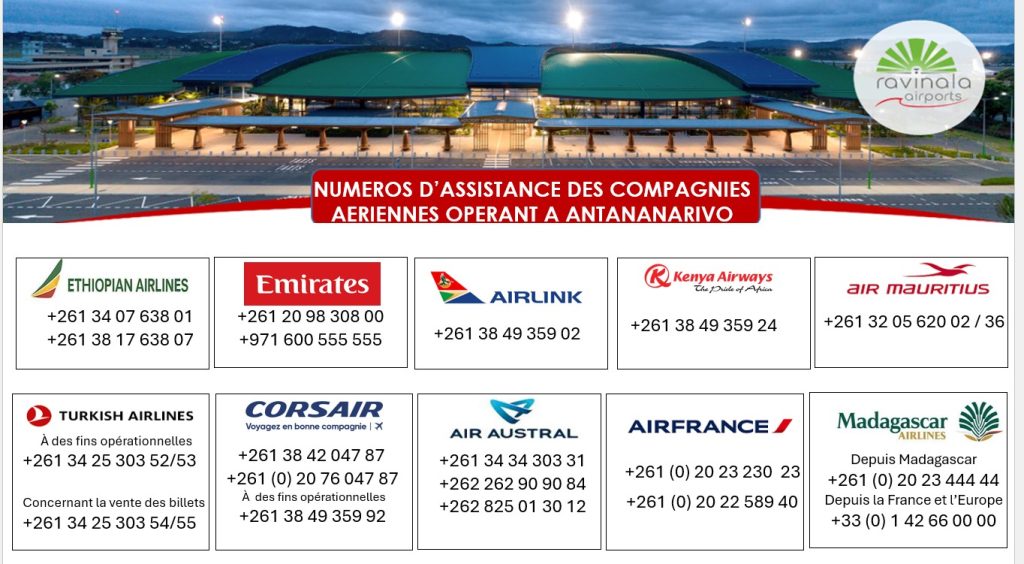 Pour toute demande d’assistance ou pour toute demande d’information concernant vos vols, nous vous invitons à contactez directement votre compagnie aérienne via les numéros cités ci-dessous :